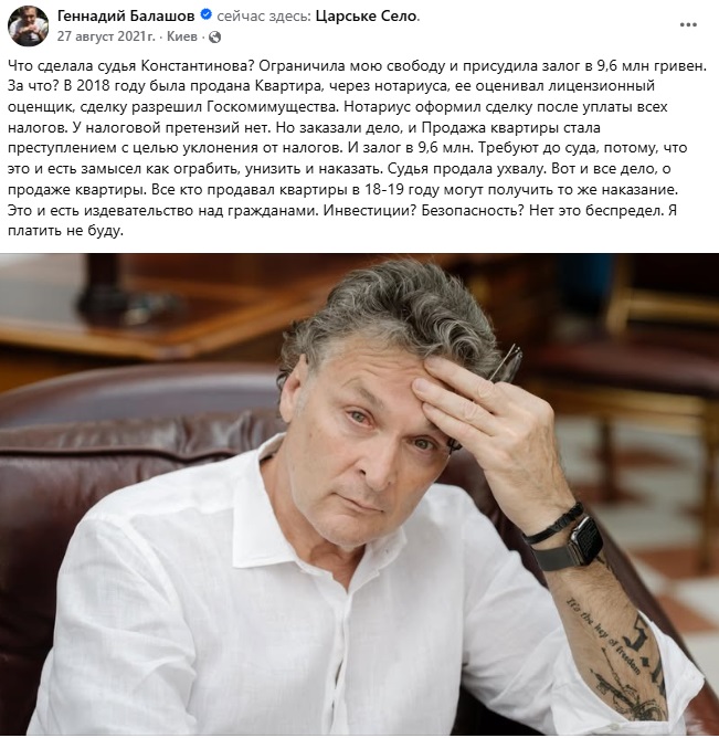 2021 року Державна фіскальна служба повідомила Балашову про підозру в несплаті 9,6 мільйона гривень податків і наклала арешт на його майно. До переліку арештованого увійшли 18 об'єктів нерухомості в Києві вартістю близько 200 мільйонів гривень.