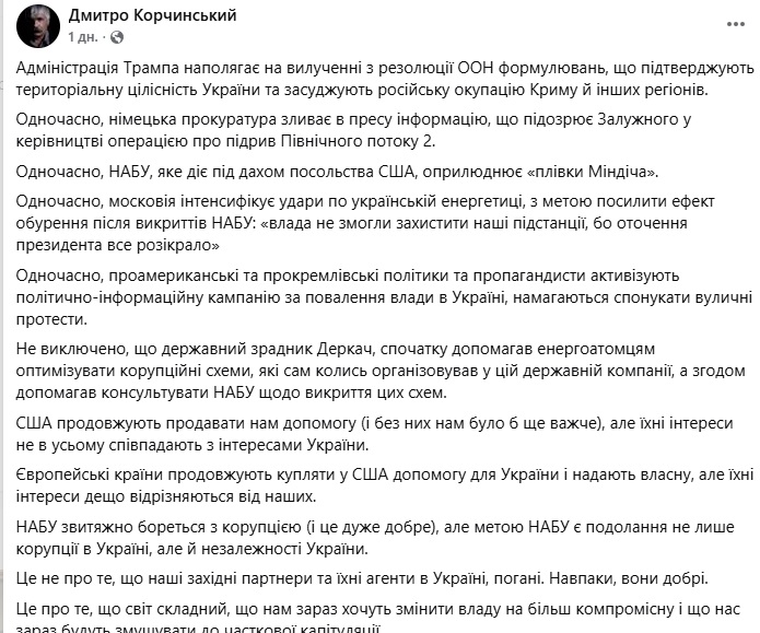 В Facebook Корчинський у деталях описав своє бачення того, як у країні хочуть поміняти владу "на більш компромісну". Зокрема, він назвав звернув увагу на вимогу адміністрації президента США Дональда Трампа вилучити з резолюції ООН формулювання, які підтверджують територіальну цілісність України і засуджують російську окупацію Криму та інших регіонів, підозру німецької прокуратури в причетності ексначальника Генштабу ЗСУ Валерія Залужного до підриву "Північного потоку", оприлюднення НАБУ "плівок Міндіча" і посилення ударів ЗС РФ по енергетиці України з метою спровокувати тотальний блекаут.