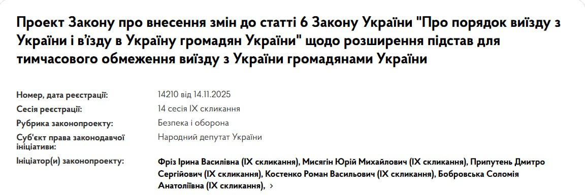 Законопроєкт передбачає розширення переліку підстав для обмеження виїзду громадян за кордон, проте конкретна інформація про те, хто саме та за яких умов може потрапити під обмеження, наразі відсутня. Варто зауважити, що тексту проєкту поки немає. Далі рішення щодо його розгляду та можливого внесення до порядку денного прийматиме керівництво Верховної Ради.