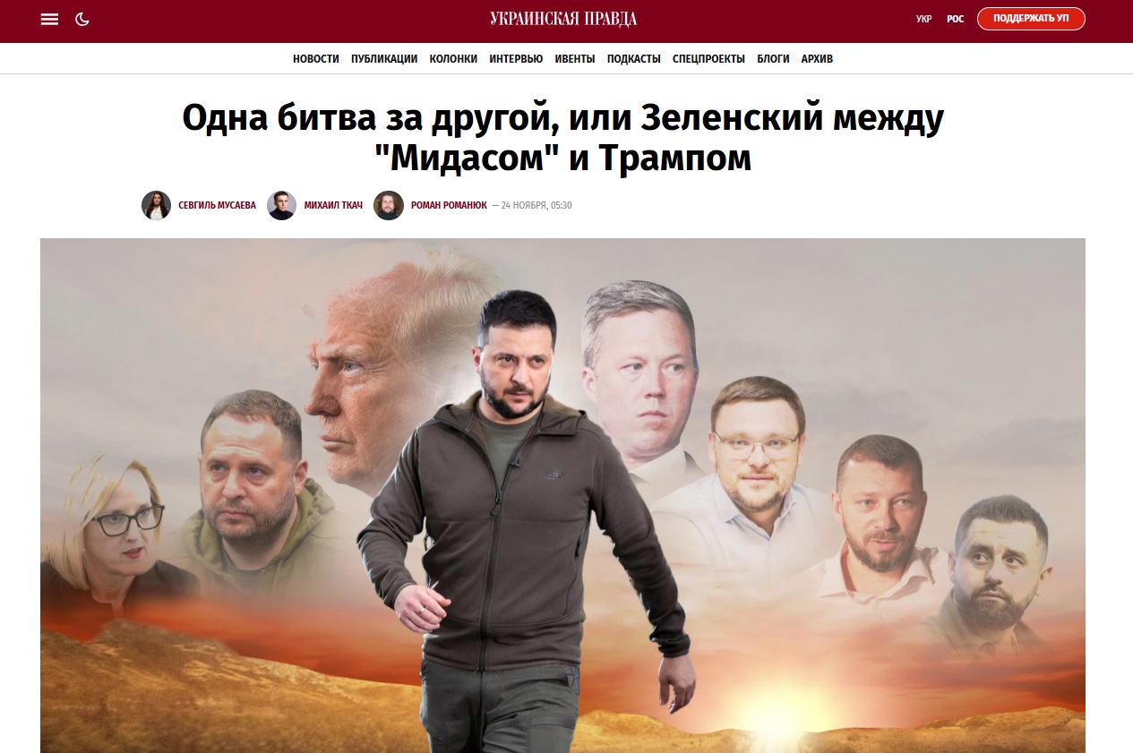 Ці заяви спровокував матеріал в "Українській правді" під назвою "Одна битва за іншою, або Зеленський між "Мідасом" і Трампом". Там, зокрема, йшлося про те, що в ОП нібито подумували про те, щоб у день зустрічі Зеленського з фракцією "Слуга народу" 20 листопада вручити очільнику Арахамії підозру в держзраді. У такий спосіб влада нібито намагалася знайти винуватців "зливу" у справі Тимура Міндіча.
