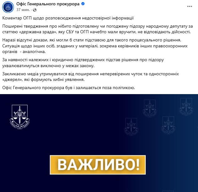 "Поширені твердження про начебто підготовлену чи узгоджену підозру народному депутату за статтею "державна зрада", яку СБУ та ОГП начебто мали вручити, не відповідають дійсності. Відсутні докази, які могли б стати підставою для такого процесуального рішення", — йдеться в офіційній заяві.