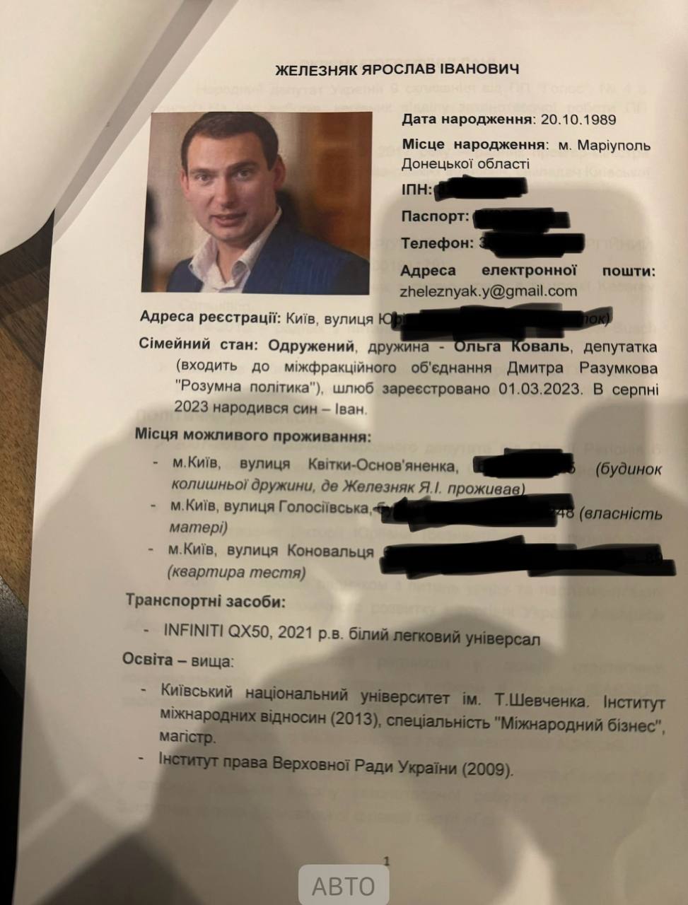 На сторінці Железняка зазначена його особиста інформація, зокрема особисті дані, адреси проживання, інформація про транспортні засоби та про освіту.
