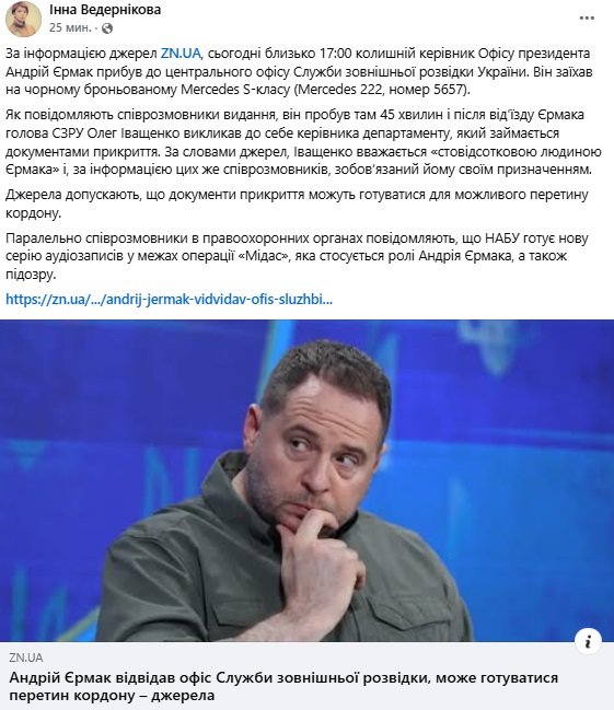 У будівлі Єрмак пробув 45 хвилин, а після його від'їзду глава СЗРУ Олег Іващенко викликав до себе керівника департаменту, що займається документами прикриття. Документи прикриття можуть готуватися до можливого перетину кордону, повідомляє ZN.UA з посиланням на своїх інформаторів.