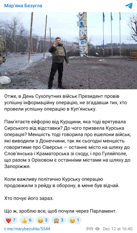 Реакцію на візит Зеленського до Куп'янська, звільненого від окупантів, Безугла опублікувала 12 грудня у своєму Telegram-каналі. Вона звинуватила голову держави в "мовчанні" про Покровськ, Мирноград, Гуляйполе, Сіверськ, Краматорськ, Ямпіль і Дніпропетровську область.