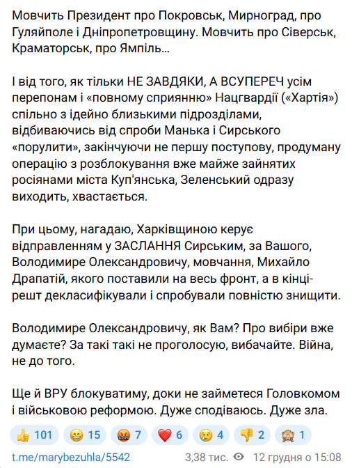 Вона додала, що обороною Харківської області керує генерал-майор Михайло Драпатий, командувач об'єднаних сил ЗСУ, колишній командувач Сухопутних військ, якого головнокомандувач Збройних сил України Олександр Сирський нібито "відправив у заслання", за словами депутатки, "за мовчання" президента.