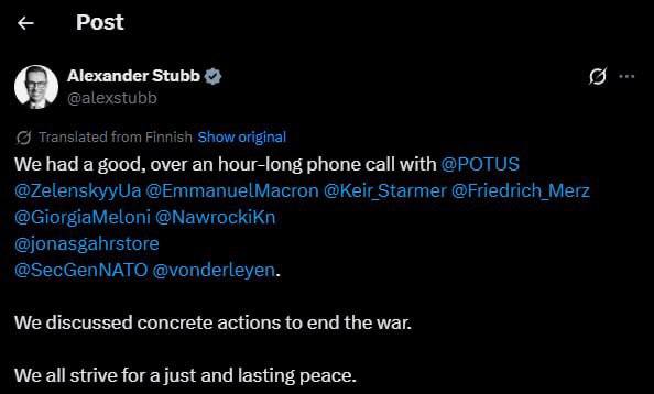 Президент Фінляндії також повідомив, що розмова Зеленського і Трампа з європейськими лідерами завершилась. На своїй сторінці у мережі X він зазначив, що зустріч тривала понад годину.