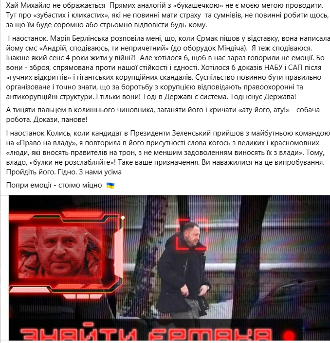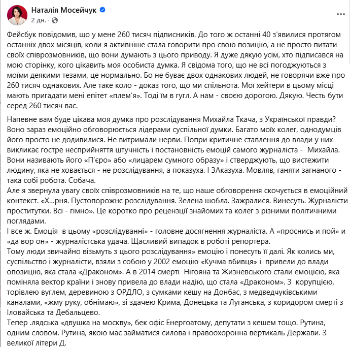 Мосейчук у попередньому дописі, який стосувався розслідування видання "Українська правда" щодо ексголови ОП Андрія Єрмака, заявила, що головне у матеріалі Ткача – це ставка саме на емоційне сприйняття його матеріалу читачами.