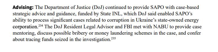 Згідно зі звітом, Міністерство юстиції США продовжувало надавати Спеціалізованій антикорупційній прокуратурі стратегічні консультації у справах, пов’язаних із корупцією в державному енергетичному секторі.