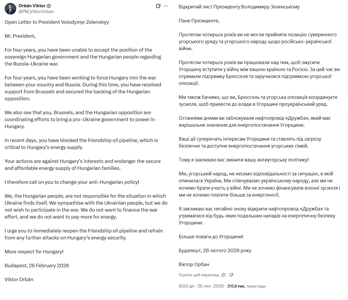 Віктор Орбан оприлюднив відкритого листа президенту України Володимиру Зеленському, у якому звинуватив Київ у спробах вплинути на вибори в Угорщині та нашкодити енергетичній безпеці країни. У повідомленні в соцмережі X Віктор Орбан заявив, що протягом чотирьох років Володимир Зеленський нібито намагається втягнути Угорщину у війну з Росією.