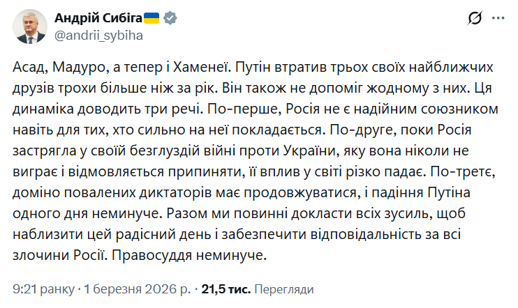 Коментар щодо ліквідації верховного лідер Ірану, аятоли Алі Хаменеї, міністр закордонних справ України Андрій Сибіга опублікував 1 березня в мережі Х. Він нагадав, що трохи більше ніж за рік було також повалено режим Башара Асада в Сирії та захоплено американськими військовими президента Венесуели Ніколаса Мадуро.