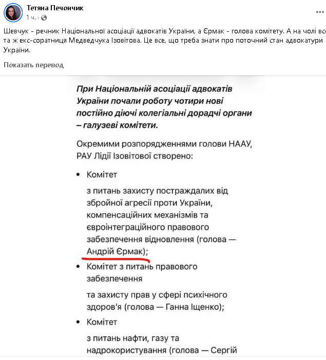 Крім того, як повідомила голова правління Центру прав людини ZMINA Тетяна Печончик на своїй сторінці у Facebook, речником Національної асоціації адвокатів України залишився Шевчук, а головою новоствореного комітету призначено Андрія Єрмака. Очолює ж асоціацію екс-соратниця Медведчука Лідія Ізовітова.