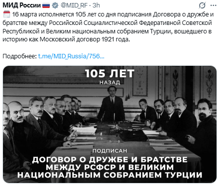 Також у МЗС нагадали, що 16 березня виповнюється 105 років від дня підписання Договору про дружбу і братерство між Російською Соціалістичною Федеративною Радянською Республікою та Великими національними зборами Туреччини, що увійшов в історію як Московський договір 1921 року.