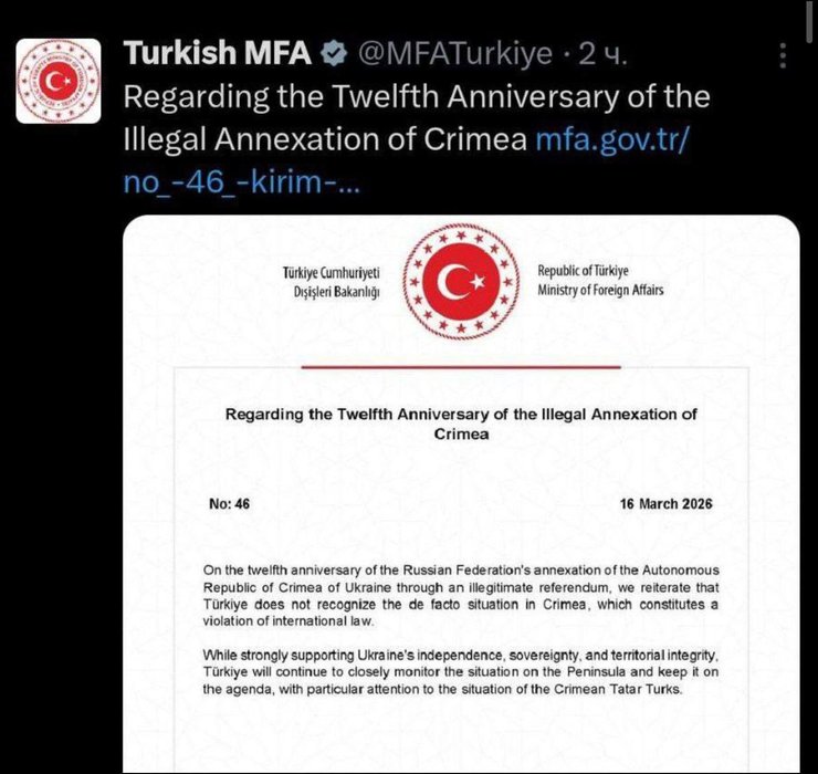 Відповідна заява пролунала в Міністерстві закордонних справ Туреччини у 12-ту річницю анексії Криму, про що йдеться на сайті відомства та на його сторінках у соцмережах.