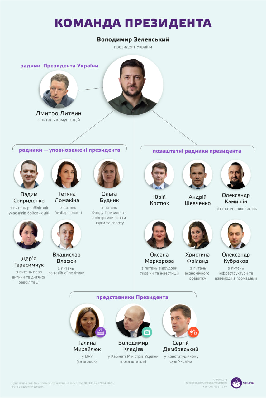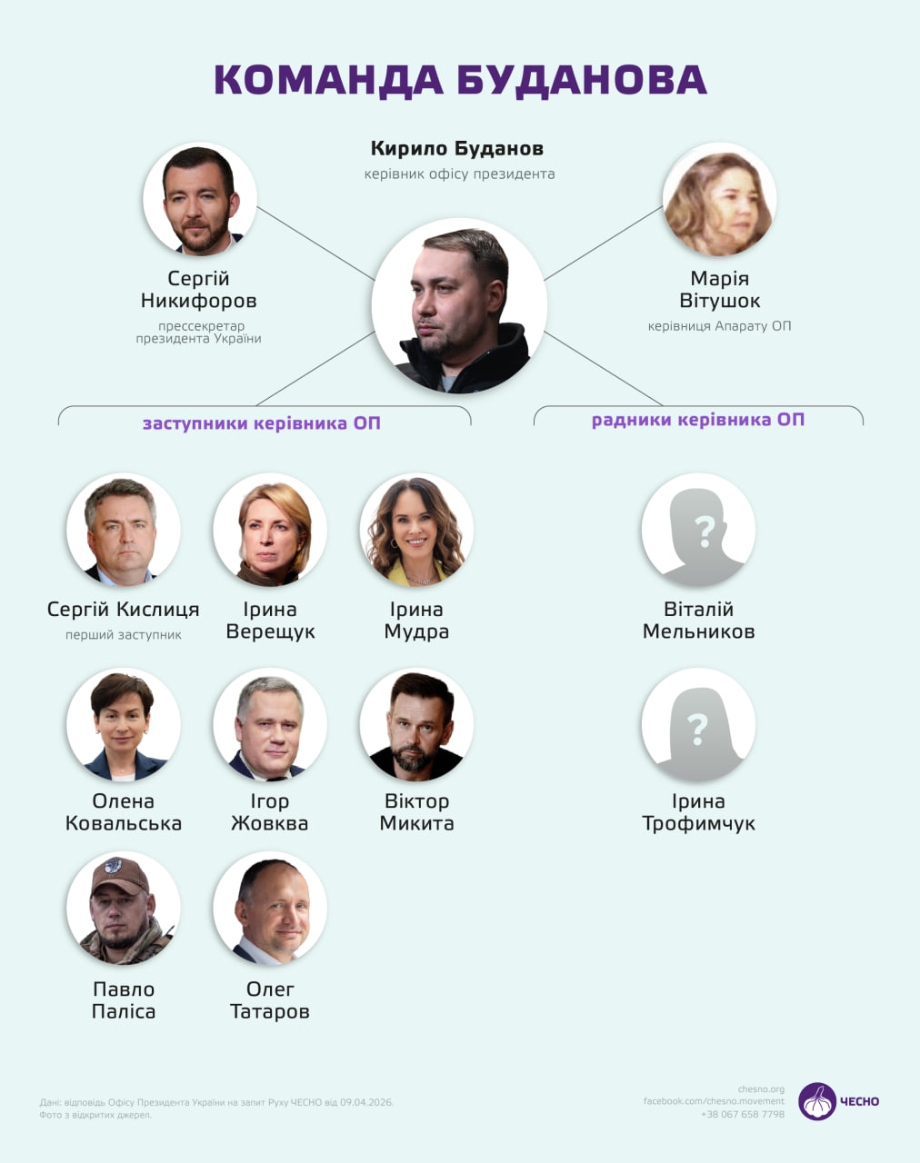 Окремо оновили команду керівника Офісу президента Кирила Буданова. Наразі вона налічує щонайменше 12 осіб, і до неї входять вісім заступників, двоє радників, прессекретар президента Сергій Никифоров і керівниця апарату Марія Вітушок. Та все ж у новому складі відсутні позаштатні радники, а серед штатних залишилися лише Віталій Мельников і Ірина Трофимчук.