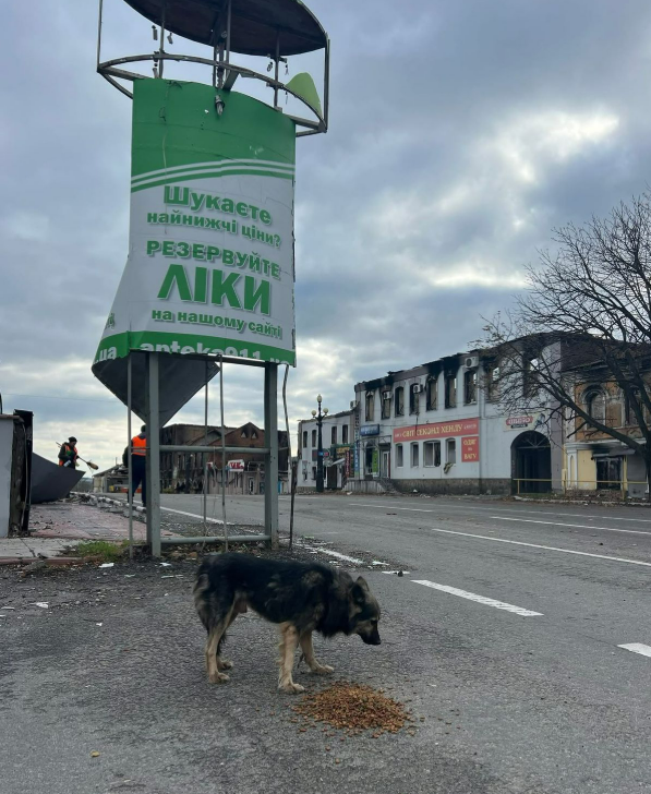 Розбомблена вулиця Купʼянську, де залишилась тільки стелла аптеки