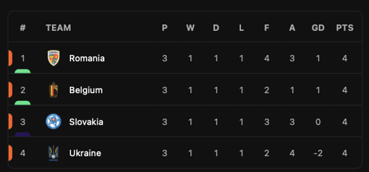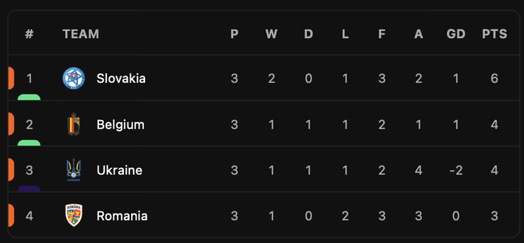 26. Словаччина вийшла вперед у матчі проти Румунії. Такий результат виводить Україну із третього місця. Бельгія – друга.