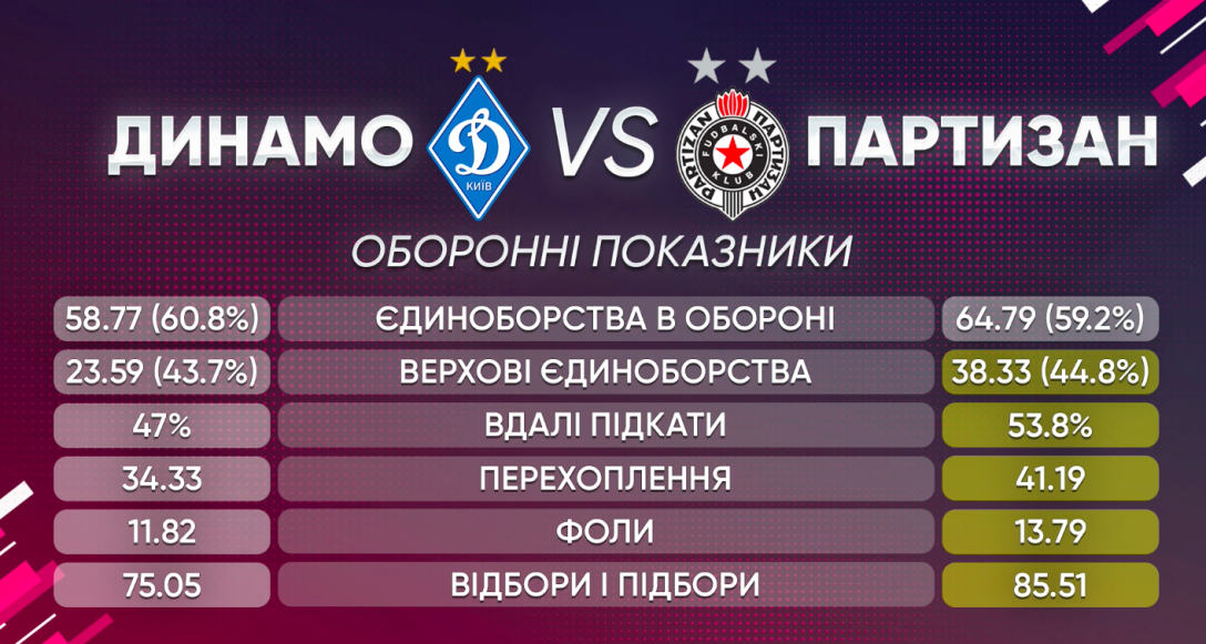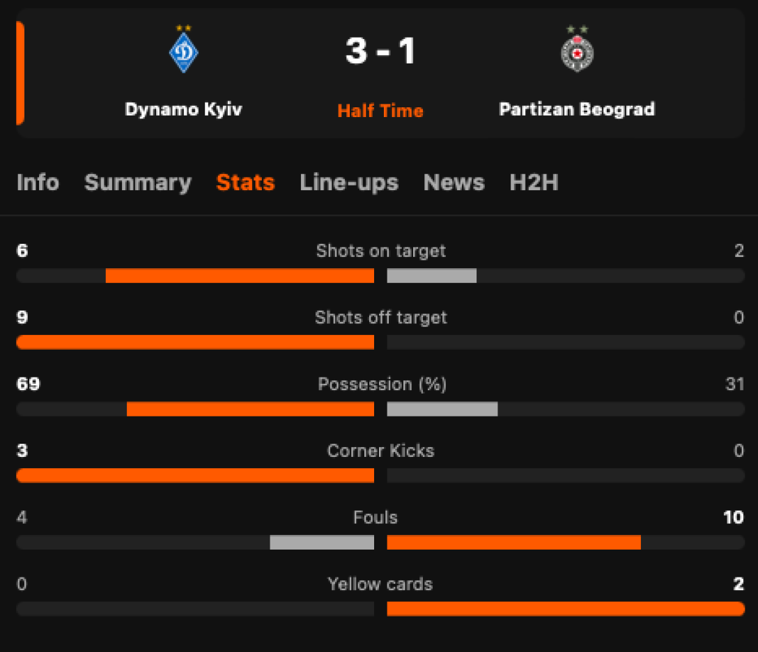 Статистика після першого тайму. У динамівців перевага за більшістю показників. Серед іншого, гравці ДК менше фолили.