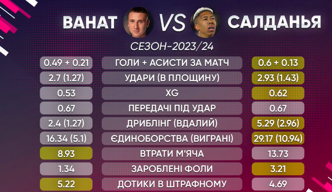 25 ХВИЛИН ДО МАТЧУ. Football Hub порівняв ТТД футболістів обох команд і, зокрема, форвардів Владислава Ваната та Матеуса Салданьї. До речі, обидва лівоногі.