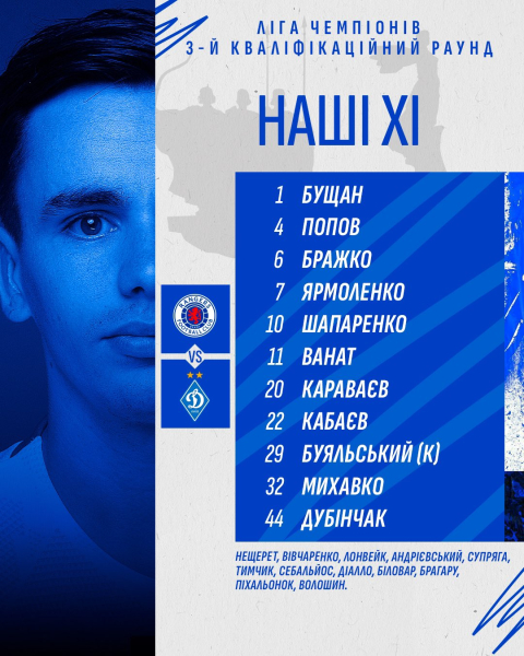 "Динамо": Георгій Бущан 35 — В'ячеслав Дубінчак 44, Тарас Михавко 32, Денис Попов 4, Олександр Тимчик 24 — Микола Шапаренко 10, Володимир Бражко 18 — Назар Волошин 9, Віталій Буяльський 29, Андрій Ярмоленко 7 — Владислав Ванат 21