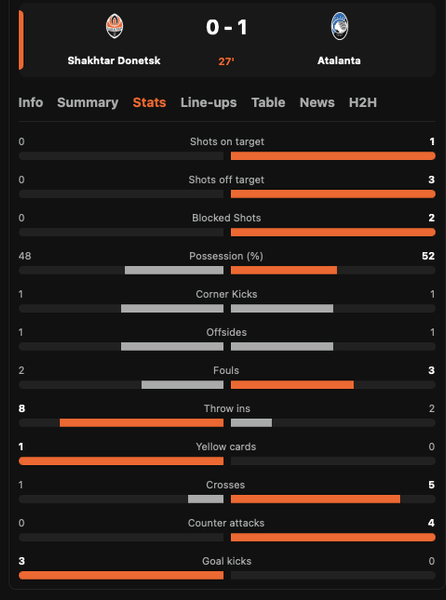 27. У Аталанти 5 ударів по воротах (в т.ч. 2 заблоковані) за перші майже пів години матчу. У Шахтаря — 0.