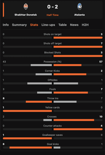 Перерва у матчі. У Аталанти 3 удари по воротах, ще 7 — повз і 3 заблоковані. У Шахтаря — всі 0.