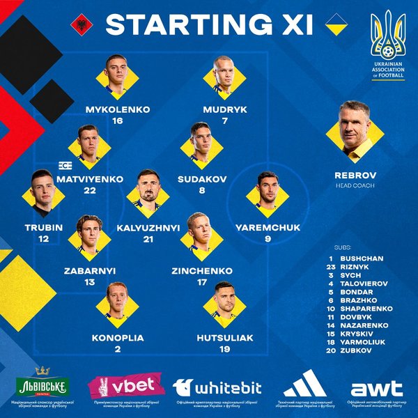 70 ХВИЛИН ДО МАТЧУ. Склад збірної. Ребров зробив чотири заміни: замість Бражка, Шапаренка, Зубкова та Довбика у стартових 11 вийшли Калюжний, Зінченко, Гуцуляк та Яремчук.