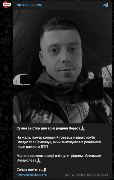 "Сумна звістка для всієї родини "Вереса". На жаль, помер колишній гравець нашого клубу Владислав Семенчук, який перебував у реанімації після важкої ДТП. Ми висловлюємо щирі співчуття рідним і близьким Владислава", — йдеться в повідомленні футбольної команди.