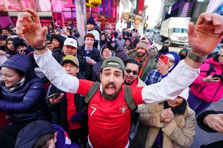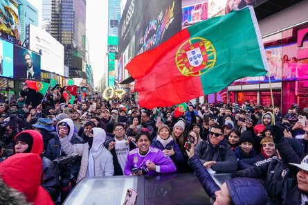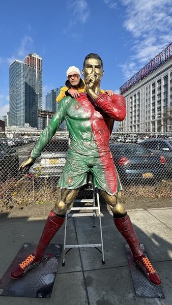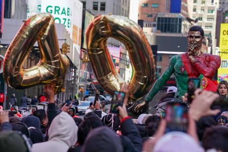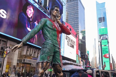 У середу, 5 лютого, пам'ятник, розфарбований у зелений, червоний і золотий кольори, доставили на позашляховику на Таймс-сквер у Нью-Йорку, де галасливі натовпи вболівальників, розмахуючи прапорами Португалії, гучно виконували фірмову святкову кричалку "Siu!" свого улюбленого гравця.