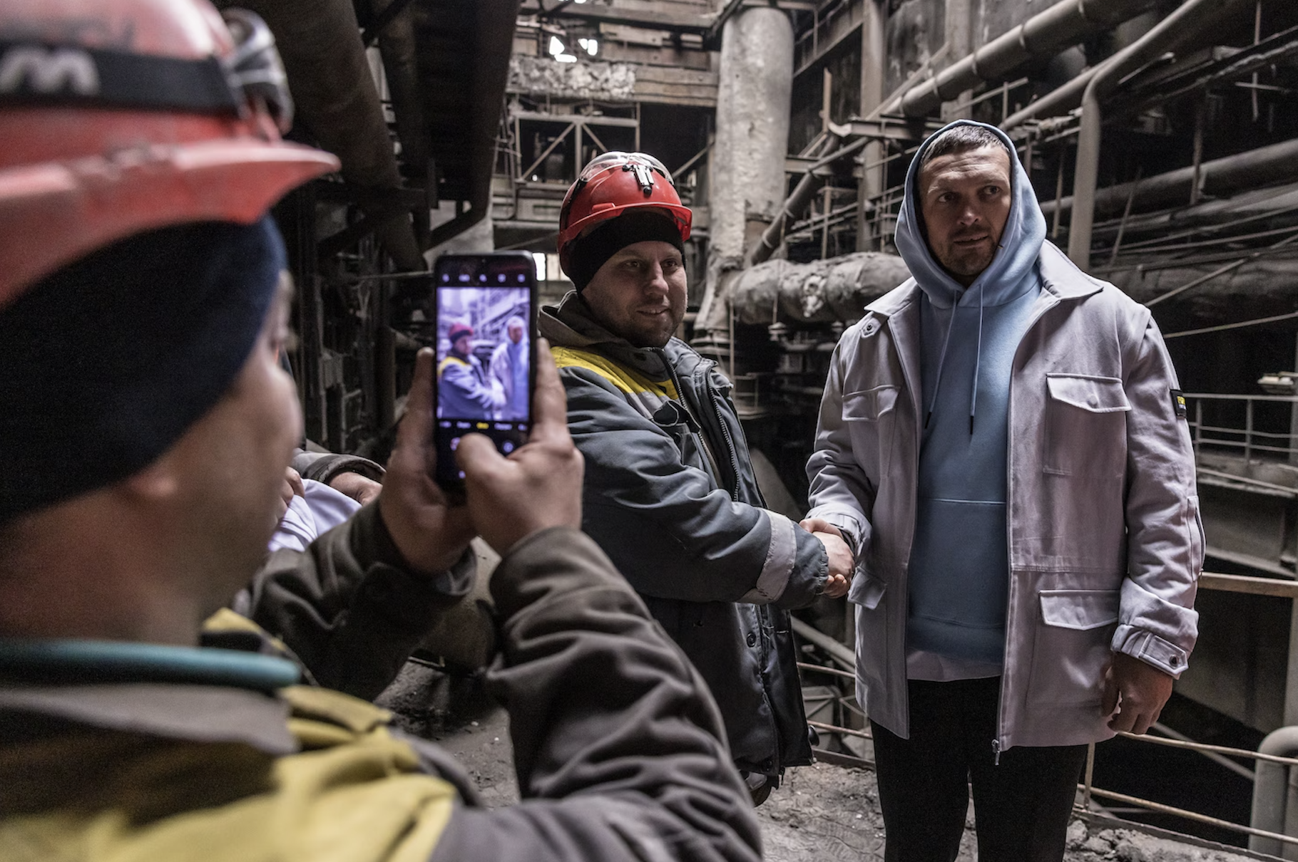 Гід провів Усика у центральну диспетчерську, де чекали працівники у касках. Вони згрупувалися навколо чемпіона, передаючи для автографів фото, бейсболки, плакати й навіть свої каски. Він "зник" серед сірої уніформи енергетиків і розпростертих рук.