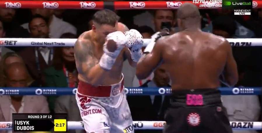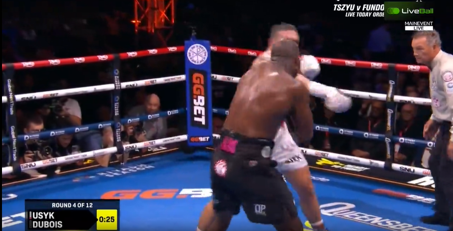 00:31 Четвертий раунд. Боксери активно обмінюються ударами. Усик завдав кілька ударів противнику у голову. Кілька натяків на удар нижче пояса від Дюбуа.