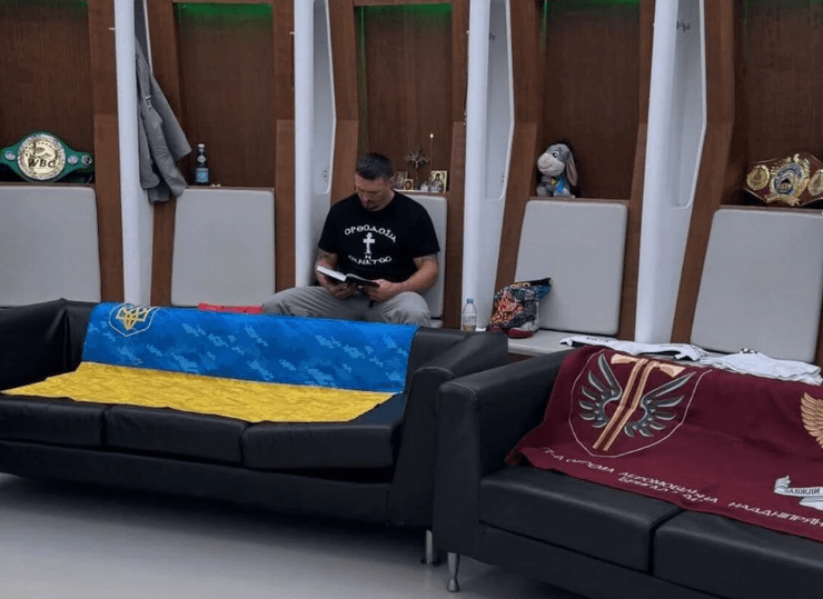 22:30 Перше фото Усика з роздягальні. Українець читає книгу, але яку саме, неясно. При цьому він одягнув футболку із зображенням православного хреста.