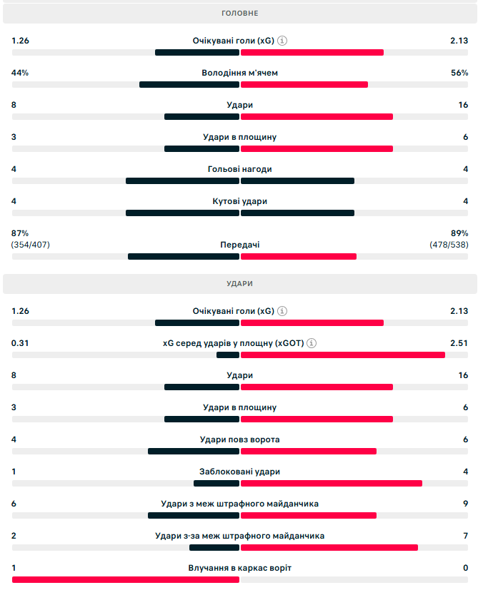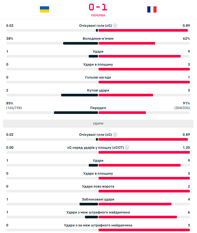 Україна — Франція, статистика матчу після першого тайму, рахунок 0-1 на користь французів
