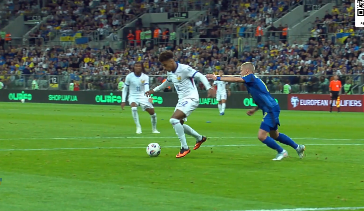 40 хв. Кілліан Мпабе загрався проти трьох захисників збірної України, але все ж зміг пробити, на щастя повз ворота.