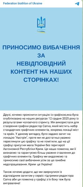Федерація біатлону України (ФБУ) оскандалилася після того, як напередодні опублікувала результати чоловічого спринту 2 етапу Кубка світу в Хохфільцені (Австрія), розмістивши на інфографіці мапу, де Україна зображена без Криму.