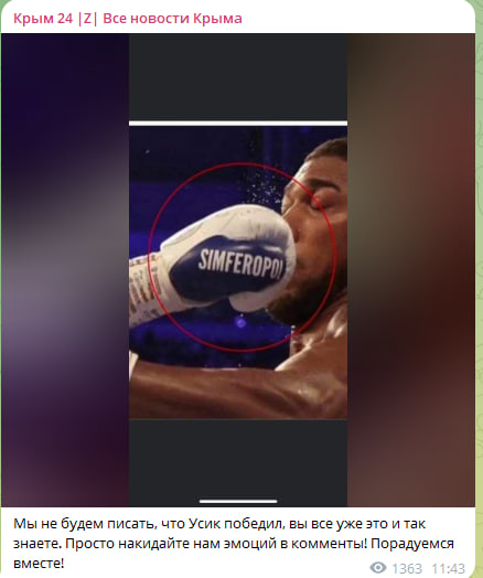 У 2021-му році, коли Олександр Усик здобував перемогу над Ентоні Джошуа, боксер бився у рукавицях з написом "Сімферополь". Тоді в каналі, який тепер називається "Крим Z", раділи за Олександра та запрошували його приїхати в Крим.