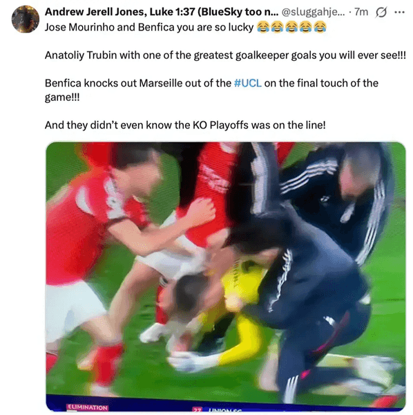 "Жозе Моурінью і "Бенфіка", вам так пощастило! Анатолій Трубін забив один із найкращих голів воротаря, які ви коли-небудь бачили!!! "Бенфіка" вибиває "Марсель" з ЛЧ на останній хвилині гри!!! І вони навіть не знали, що на кону стояла участь у плей-офф!" — написав один із користувачів.