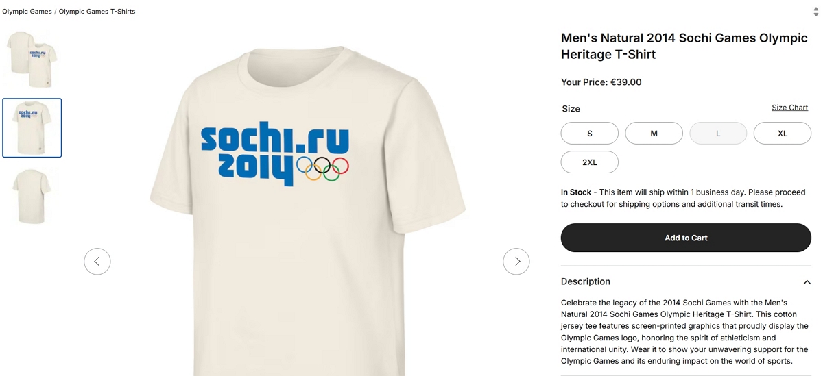 А в описі до неї сказано: "Відзначте спадщину Олімпійських ігор 2014 року в Сочі за допомогою чоловічої футболки Natural 2014 Sochi Games Olympic Heritage. Ця футболка з бавовняного трикотажу прикрашена трафаретним друком із зображенням логотипу Олімпійських ігор, що віддає данину поваги духу атлетизму та міжнародній єдності. Носіть її, щоб показати свою непохитну підтримку Олімпійських ігор та їхнього неминущого впливу на світ спорту".