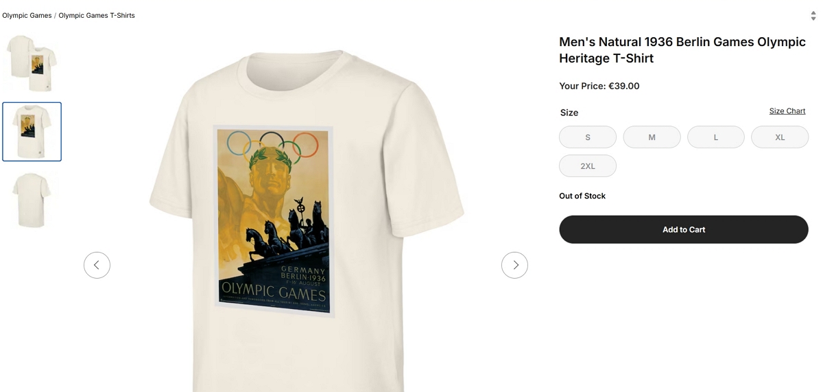 Футболку продавали в інтернет-магазині в рамках так званої "Колекції спадщини", до якої входять товари з символікою Олімпійських ігор минулих років. Наразі вона розпродана і більше не доступна в магазині. На футболці зображена чоловіча фігура з лавровим вінком над квадригою Бранденбурзьких воріт, під олімпійськими кільцями, а також напис "Німеччина, Берлін, Олімпійські ігри 1936".