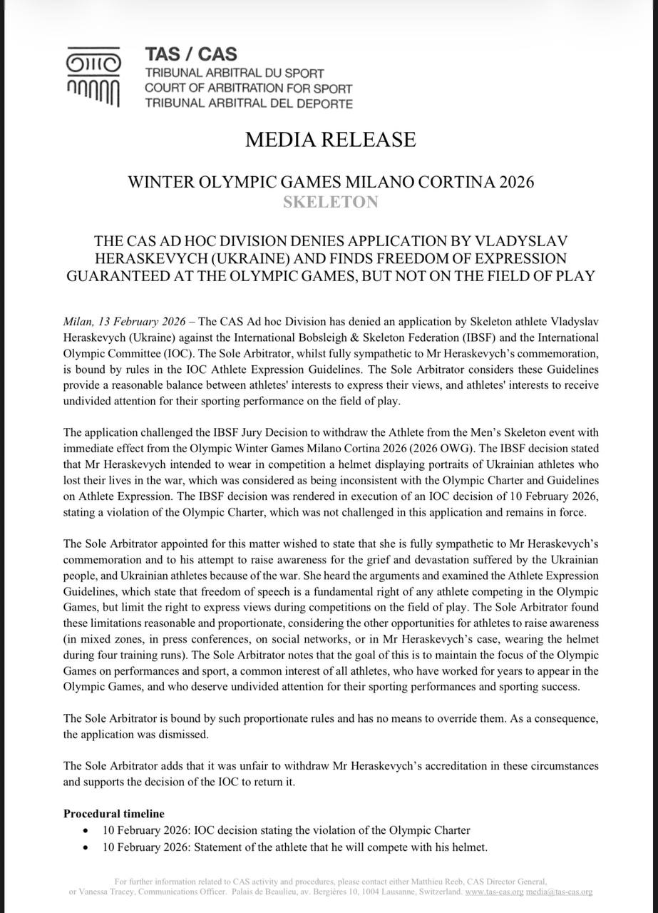 Міжнародний спортивний суд (CAS) відхилив позов українського спортсмена Владислава Гераскевича до Міжнародного олімпійського комітету (МОК) та Міжнародної федерації бобслею та скелетону (IBSF).