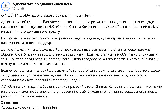 Водночас Колесник готовий до відкритої співпраці зі слідством і вже подав заяву про заподіяння йому тілесних ушкоджень. Наразі адвокати наполягають на повному та неупередженому розслідуванні події, а також на забезпеченні правового захисту футболіста на основі принципів верховенства права, рівності сторін і законності.