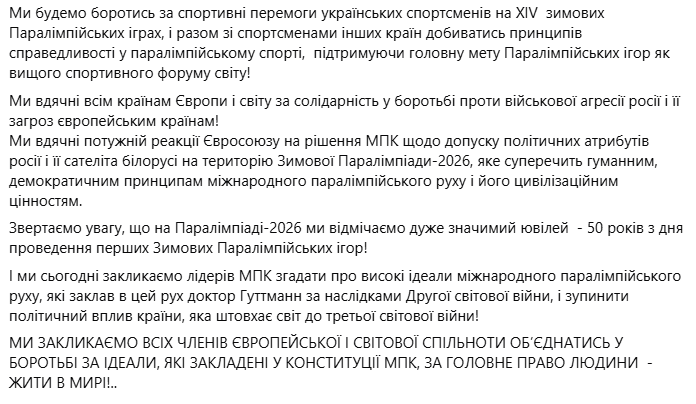 Також українці закликали лідерів МПК згадати "про високі ідеали міжнародного паралімпійського руху, які заклав у цей рух доктор Гуттманн за результатами Другої світової війни, і зупинити політичний вплив країни, що штовхає світ до третьої світової війни":