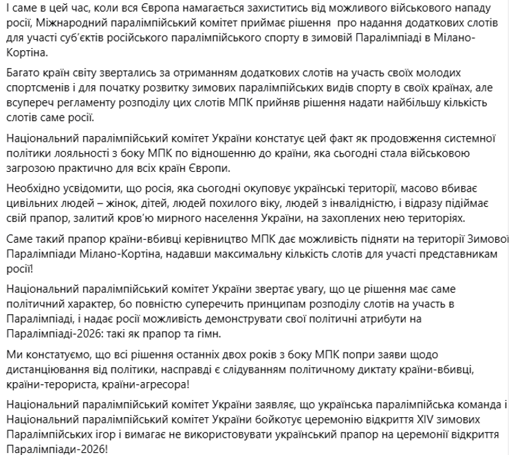 "Саме такий прапор країни-вбивці керівництво МПК дозволяє підняти на території Зимової Паралімпіади Мілано-Кортіна, надавши максимальну кількість слотів для участі представникам Росії!" — констатують автори заяви.