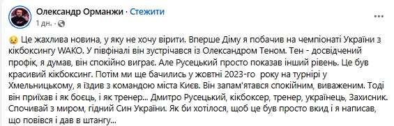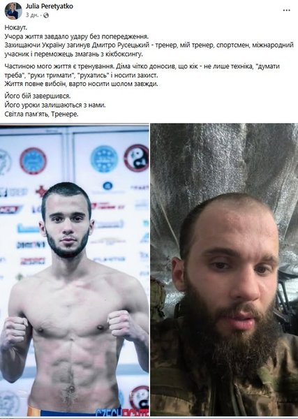 "Частиною мого життя є тренування. Діма чітко доносив, що кік — не тільки техніка, "думати треба", "руки тримати", "рухатися" і носити захист. Життя повне вибоїн, варто носити шолом завжди. Його бій завершився. Його уроки залишаються з нами. Світла пам'ять, Тренере", — сумує вихованка Русецького Юлія Перетятко.