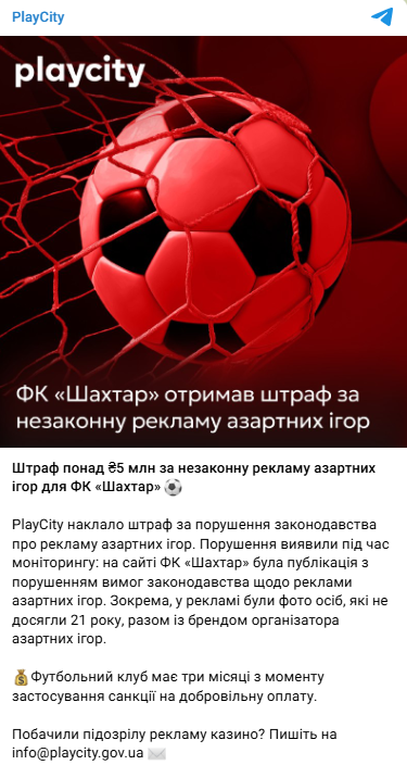 "Порушення виявлено під час моніторингу: на сайті ФК "Шахтар" була публікація з порушенням вимог законодавства щодо реклами азартних ігор. Зокрема, у рекламі були фото осіб, які не досягли 21 року, разом із брендом організатора азартних ігор", — ідеться в поясненні.