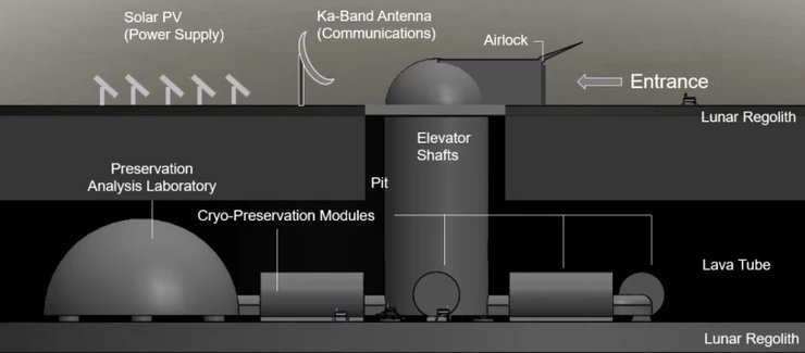 Команда вважає, що місячний ковчег може бути побудований всередині лавових труб, що недавно були виявлені прямо під поверхнею Місяця. Шахти ліфтів можуть спускатися вниз у приміщення, де зразки будуть зберігатися в модулях кріогенної консервації, охолоджуючи насіння до -180 ° C, а клітини тварин до -196 ° C. Уся система може працювати від сонячних батарей на поверхні.