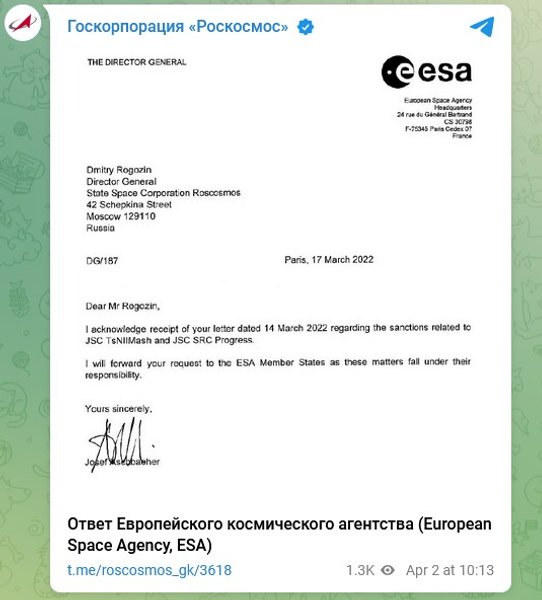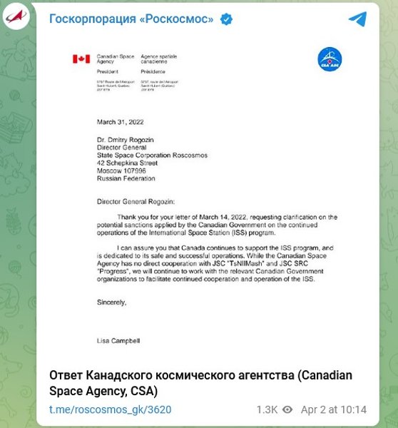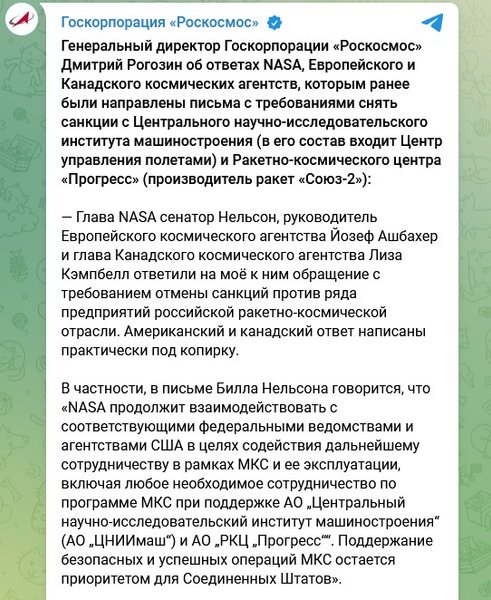 Враховуючи те, що глава Роскомоса дав NASA, ЕКА та ККА термін до кінця березня, щоб отримати відповідь на свої листи, глави західних космічних агенцій виконали його прохання. Листи-відповіді Роскосмос розмістив у своєму Telegram-каналі.