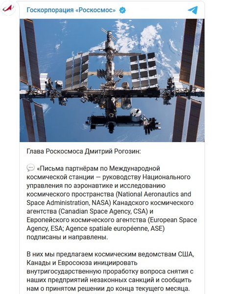 Ще 14 березня 2022 року голова Роскосмосу Дмитро Рогозін надіслав листи до NASA, Європейського космічного агентства (ЄКА) та Канадського космічного агентства (ККА). У зверненні до керівників цих агентств Рогозін запропонував розглянути питання зняття, як назвав їх чиновник "незаконних" санкцій, які були накладені на підприємства аерокосмічної галузі РФ через вторгнення Росії до нашої країни. У листах Рогозін зазначив, що чекає на відповідь до кінця березня. Після цього, за його словами, РФ зможе оприлюднити свою позицію щодо можливого припинення співпраці із західними країнами на орбітальній станції.