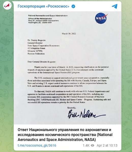 Адміністратор NASA Білл Нельсон у своєму листі Рогозіну повідомив, що США підтримують подальшу співпрацю з Росією на МКС. У листі сказано, що нові та існуючі заходи експортного контролю США, як і раніше, дозволяють продовжувати взаємодію між країнами, щоб забезпечити безпечну експлуатацію МКС. Адже це головний пріоритет США.