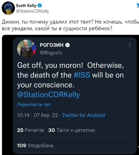 "Що стосується виходу Росії з проєкту МКС, то я вважаю, що це буде більша втрата для них, ніж для США. Але я все ж таки сподіваюся, що до моменту закінчення експлуатації МКС у 2030 році Росія не залишить станцію. Це буде величезною шкодою не тільки для Росії, а й для людей, які працюють у космічній галузі, для їхніх космонавтів. Я їх давно знаю, у мене серед них багато друзів", — каже Келлі.
