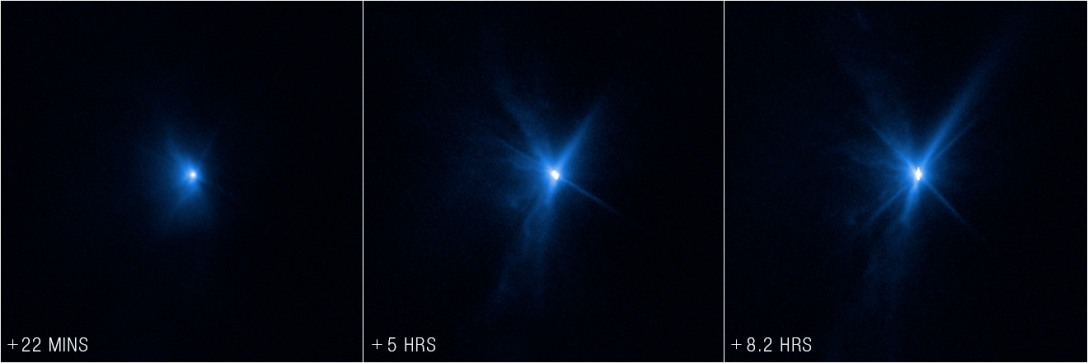 За словами вчених, після зіткнення яскравість астероїда Діморфа збільшилася в кілька разів. На самих знімках можна побачити момент вибуху, а також викид матеріалу з поверхні цільового астероїда, внаслідок удару по ньому апарату DART (знімки телескопа Габбл)